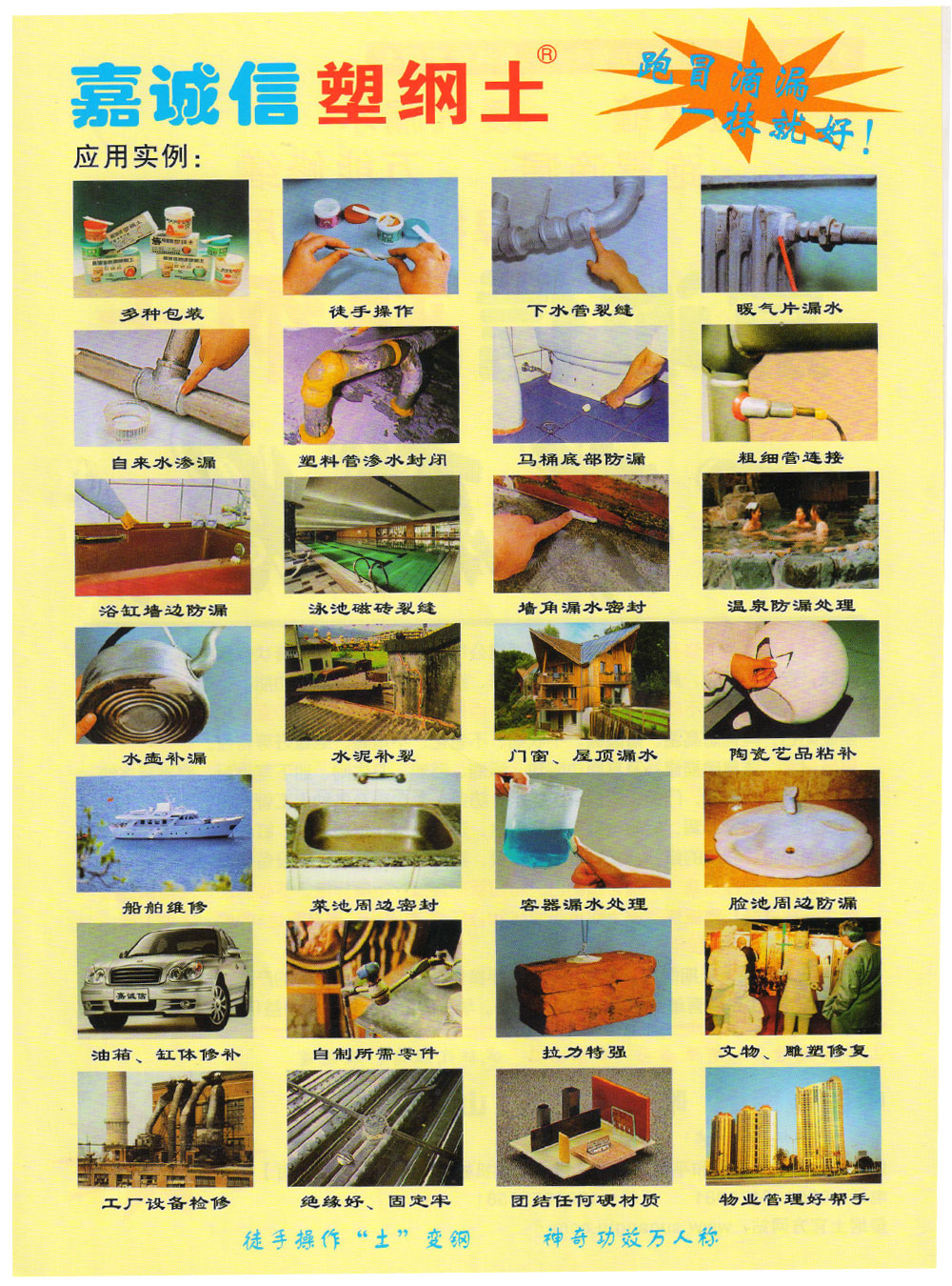 山西嘉誠信實業有限公司多年來一直致力于塑鋼土的研究、開發,為塑鋼土在我國的推廣、應用與普及立下了汗馬功勞!嘉誠信早已成了塑鋼土的代名詞,嘉誠信就是塑鋼土,塑鋼土就是嘉誠信。跑冒滴漏滲就找嘉誠信,要買塑鋼土還找嘉誠信,已成為廣大用戶的共識!